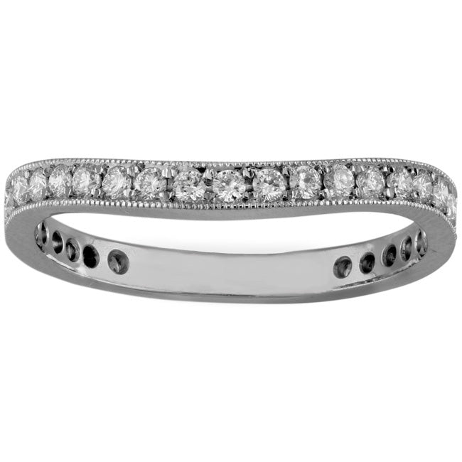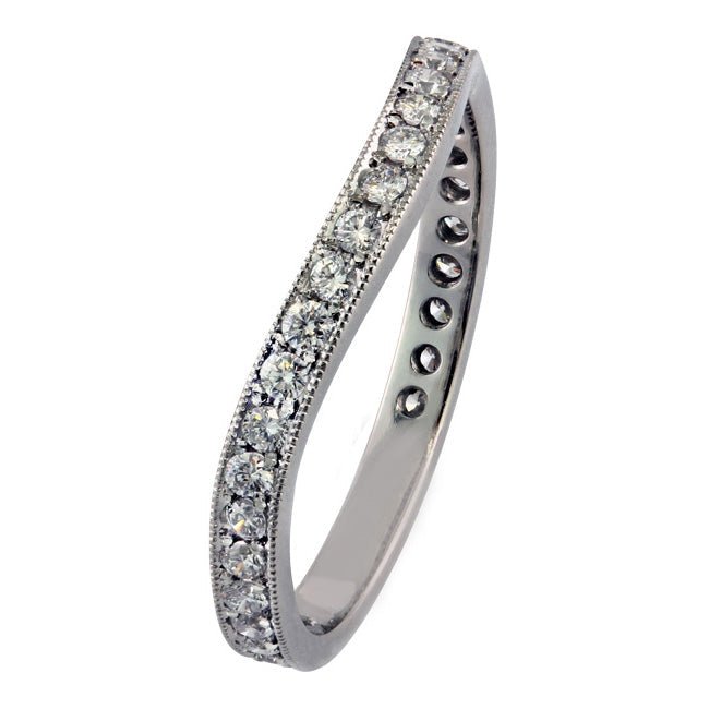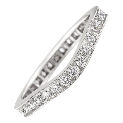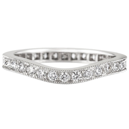 This gently curved diamond eternity ring is 2.2mm wide and sits well against many low set engagement rings. The round brilliant cut diamonds are framed by millegrain edging.