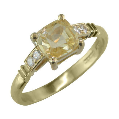 This ring is based on one of our original vintage style rings from the 1930s and customised by teaming the square cushion yellow sapphire together with yellow gold. The visual effect is stunning.