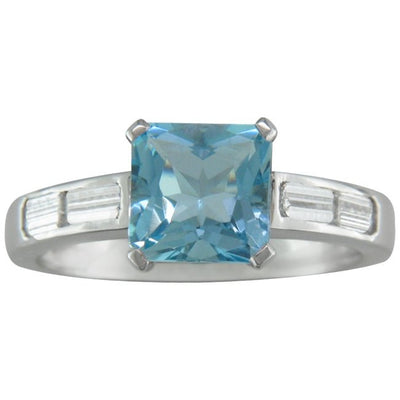 The square, emerald-cut central aquamarine, weighing 1.67 carats, is held in 4 prongs of platinum protecting each corner of the vibrant blue gemstone. The aquamarine is set on a rectangular platinum band two baguette-cut diamonds are channel set on each shoulder with a total diamond weight of 0.40 carat.