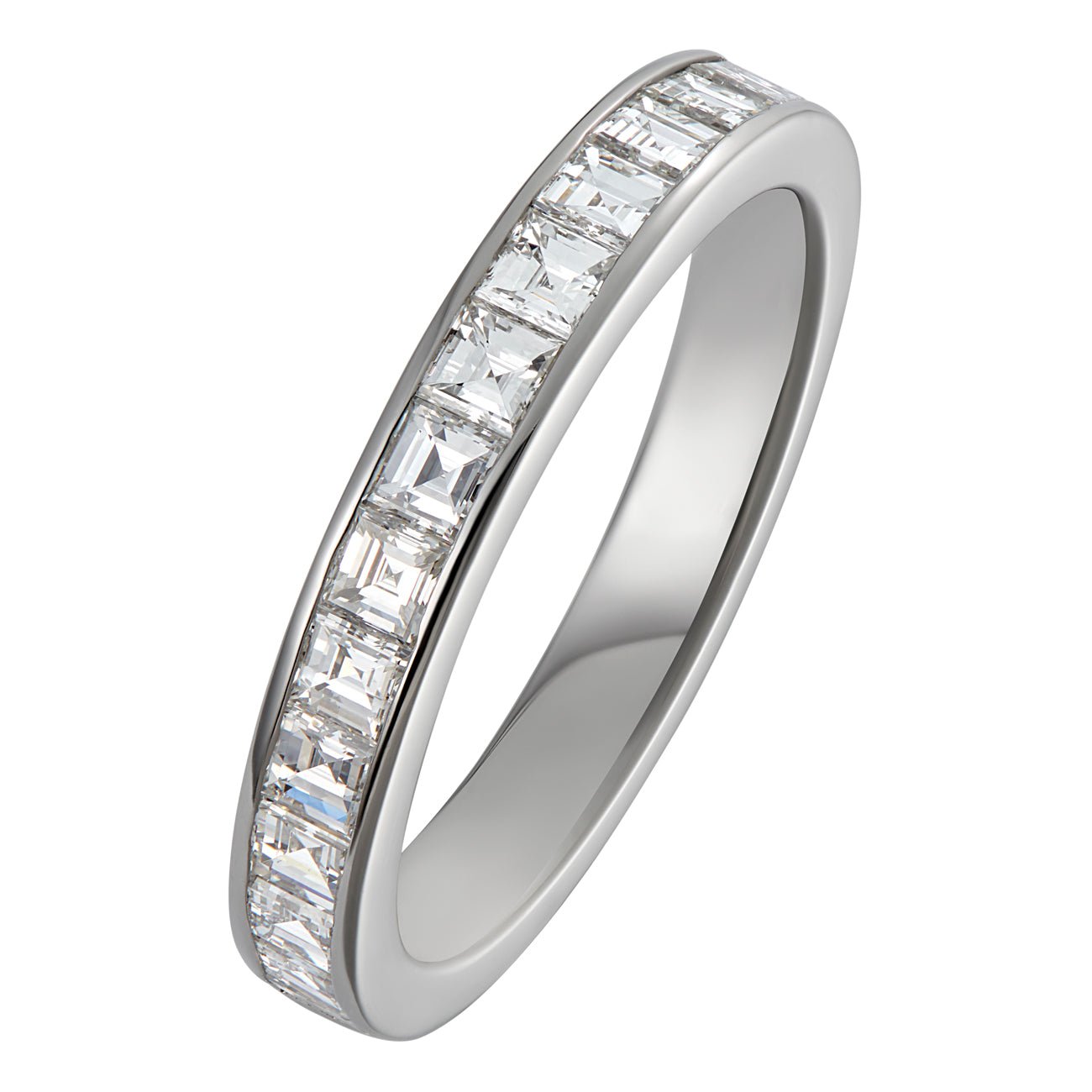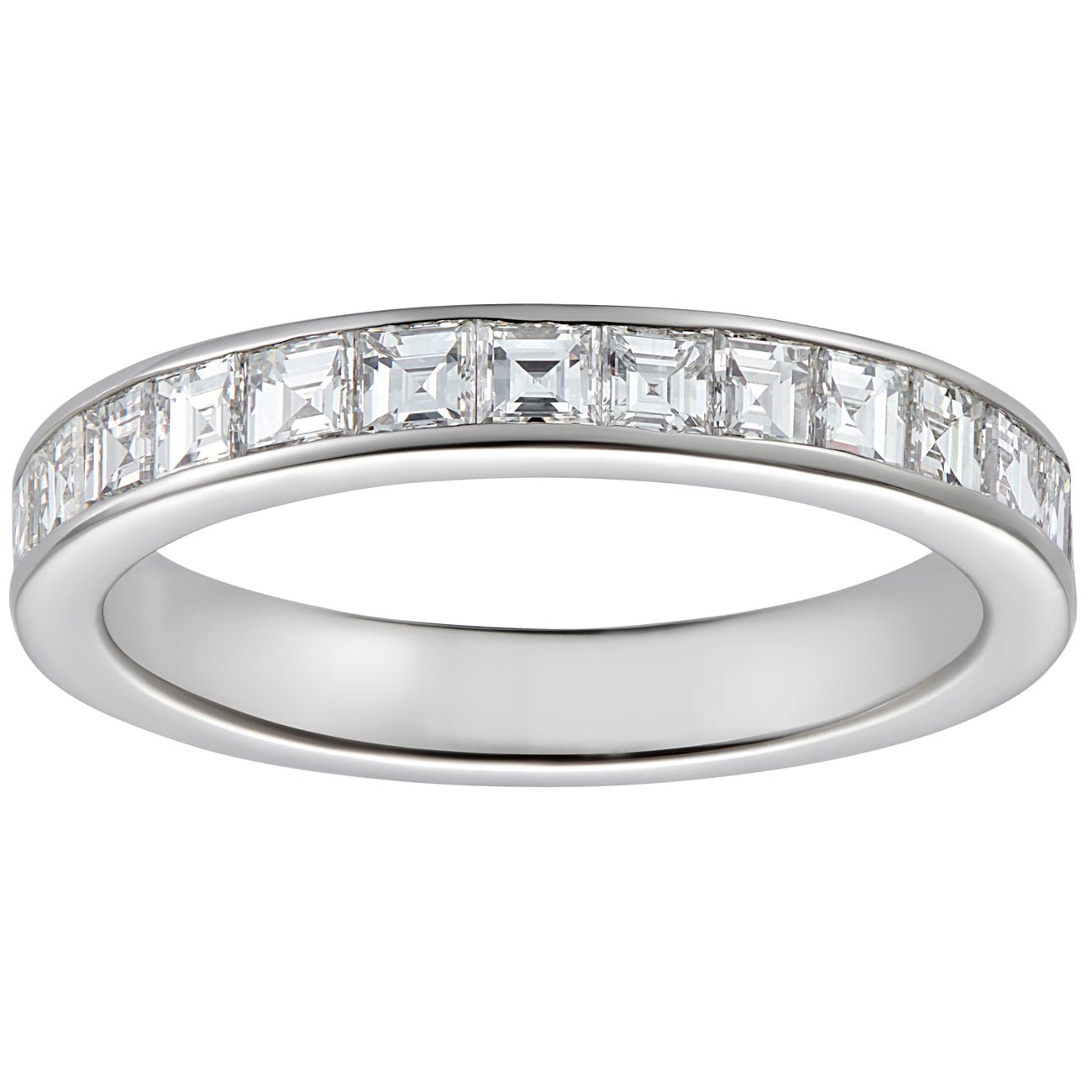 This 3mm diamond half eternity ring in platinum is a perfect choice to complement an emerald-cut engagement ring. The 15 square step-cut diamonds weigh 0.70 carat in total.