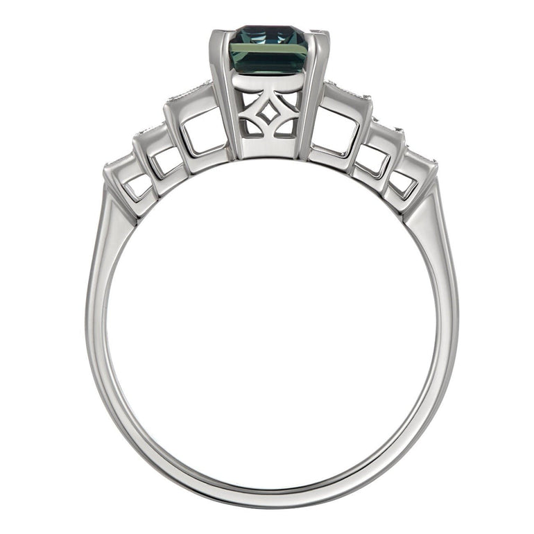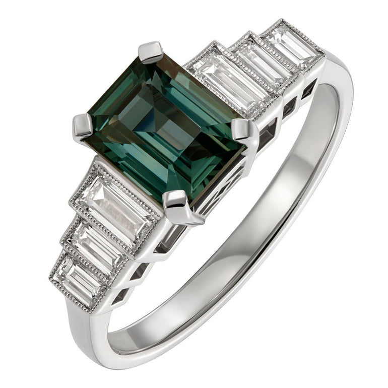 This Art Deco teal sapphire engagement ring features an emerald cut teal sapphire in the centre. The seven stone ring is accented with stepped baguette diamonds on the shoulders, with a fine millegrain edge around each diamond.