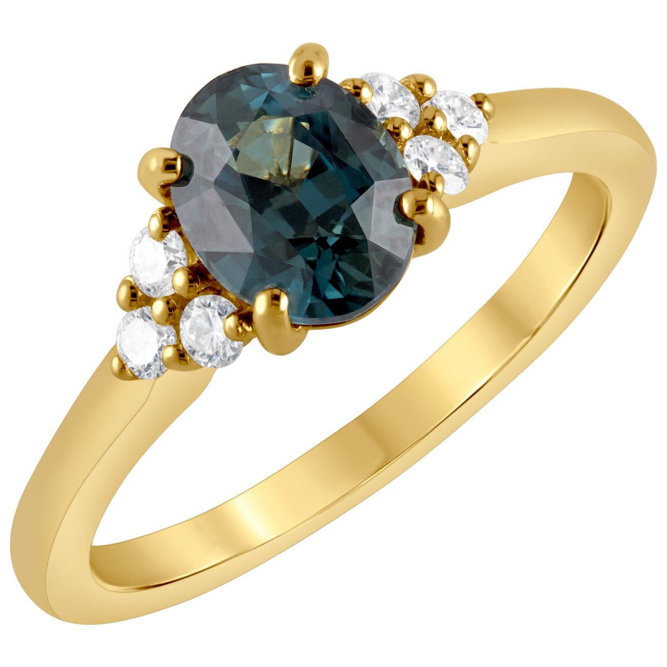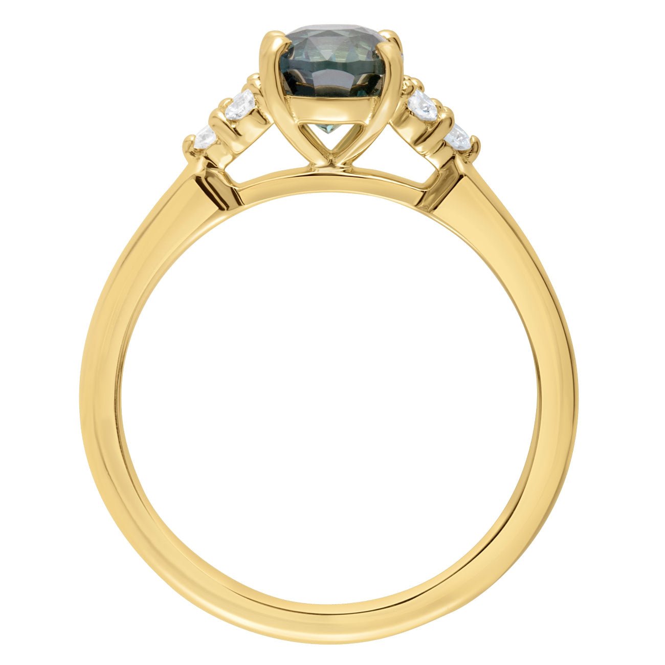 Our teal green sapphire engagement ring offers a captivating alternative to a traditional diamond ring. The central oval teal sapphire is showcased in a classic four-claw setting to celebrate its deep, calming hues.