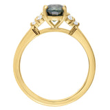 The teal green sapphire is complemented by a trefoil of round brilliant cut diamonds on each shoulder, adding brilliance and contrast against the rich warmth of the 18ct yellow gold band to ensure it glistens when worn. Designed to sit perfectly alongside a wedding band for a seamless fit.