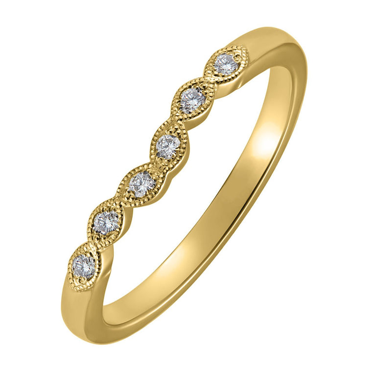 This thin 1.7mm diamond wedding ring in 18ct yellow gold has a gentle curve to go around your engagement ring. The wedding ring is set with six round brilliant cut diamonds.