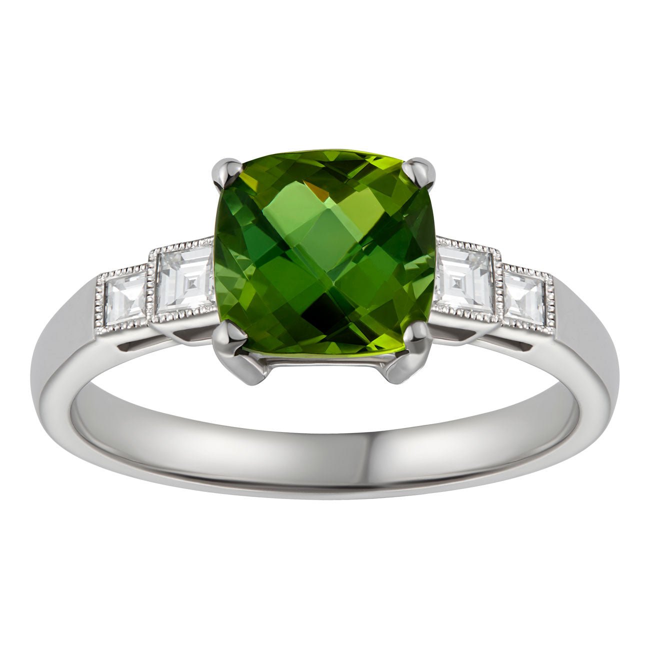 Tourmaline engagement ring with step-cut diamonds in white gold