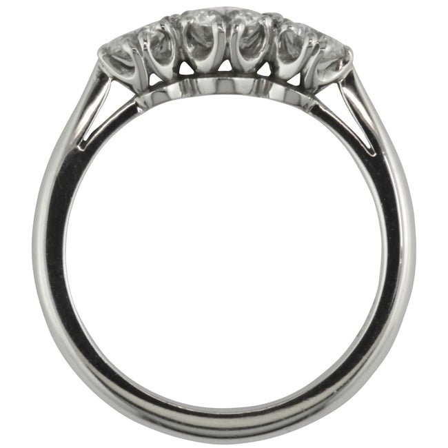 This diamond and platinum ring is made in a traditional design that is as stylish today as generations ago. This ring is easy-to-wear and fashionable for a busy modern lady.