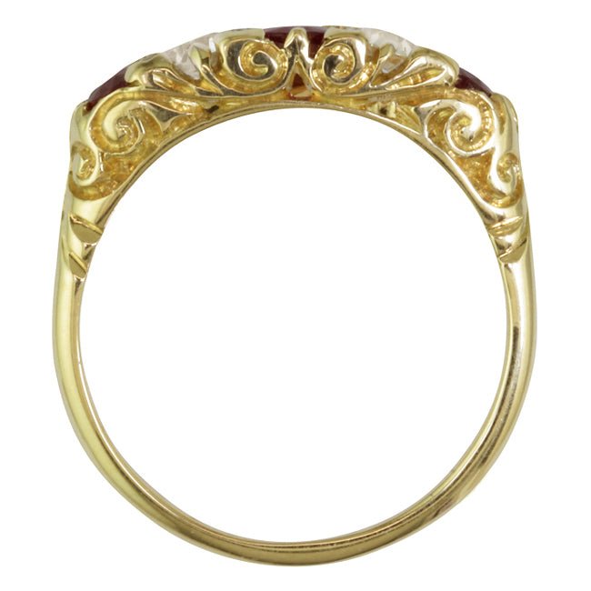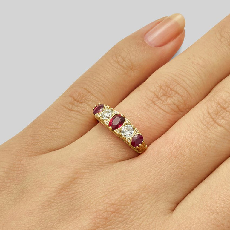 This Victorian style carved half hoop ring features three oval rubies and two Victorian-cut diamonds. The larger gemstones are interspersed with eight rose-cut diamond points.