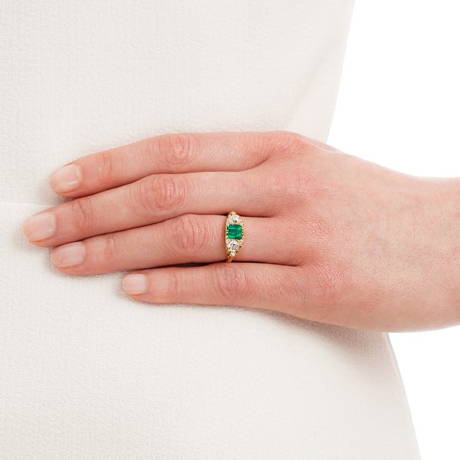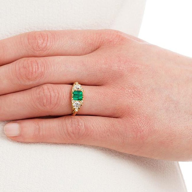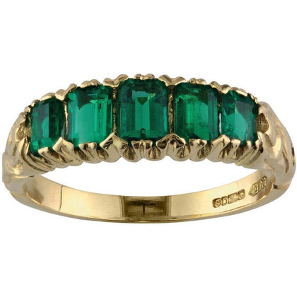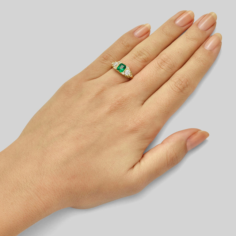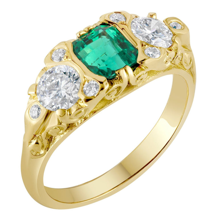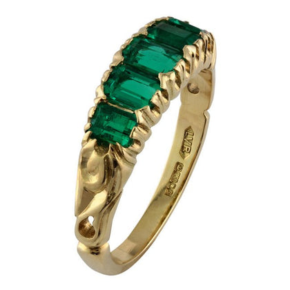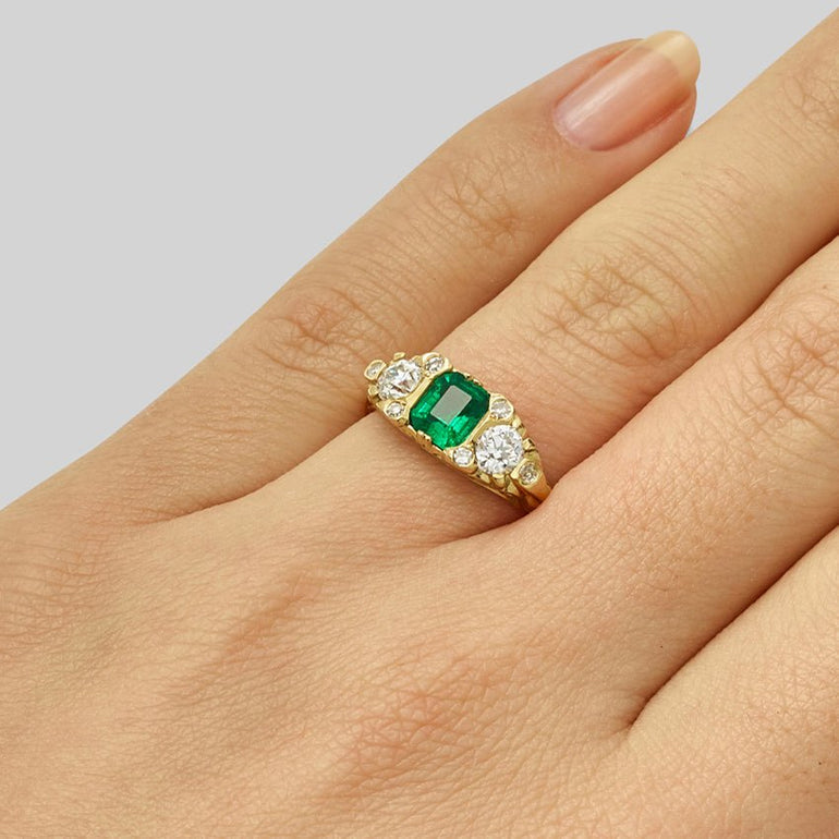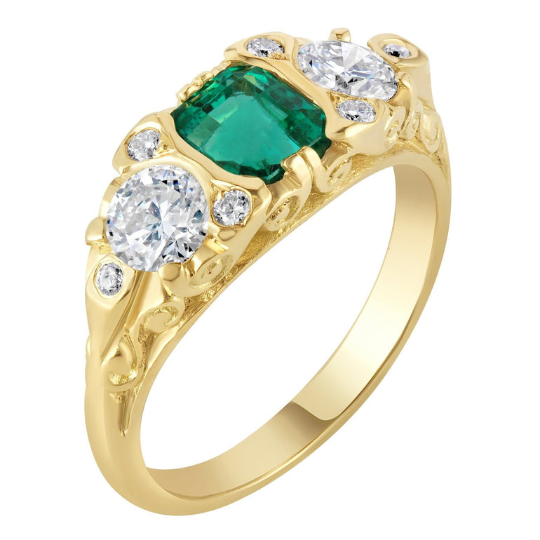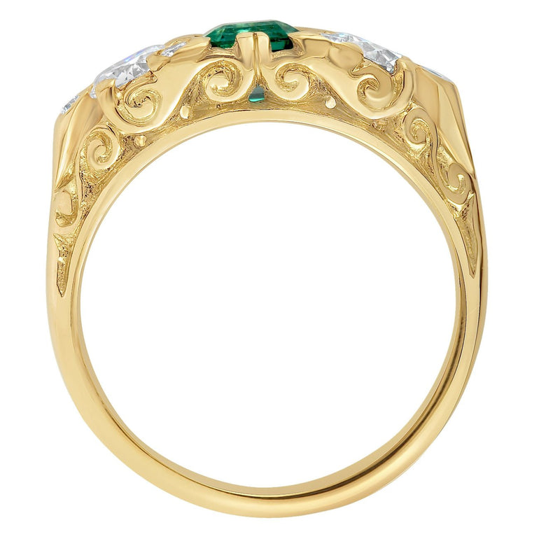 This Victorian style carved half hoop ring is set with a fine quality emerald and two diamonds.
