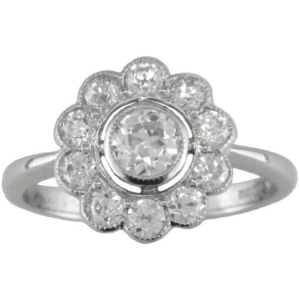 This vintage design diamond cluster ring features unusual diamond-set spiral shoulders. This elegant platinum ring is made in the Edwardian style, with elements of the Art Deco era that was to follow.