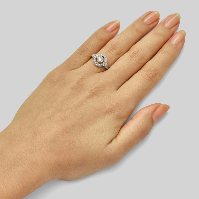 The 26 surrounding diamonds weigh 0.31 carat in total with a colour F/G to complement the main diamond.