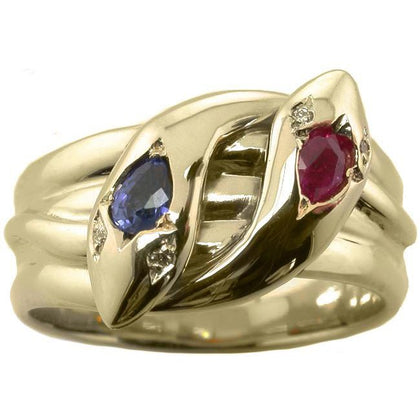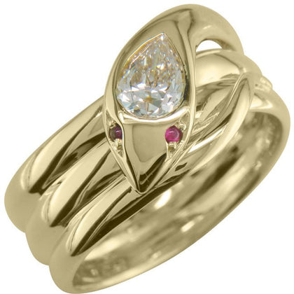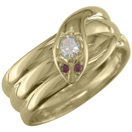 This ancient symbol of a snake was worn in Greek and Roman eras as charms or amulets to protect the wearer. The snake or serpent is a symbol of eternity and is also associated with several healing deities, including Asclepios, the Greek god of medicine. The rings were popular throughout the 19th century, and the snake motif became a well-known Victorian ring style. A snake ring with emerald eyes was given to Queen Victoria as an engagement ring by Prince Albert. The V&A Museum in London has a triple coiled gold ring with ruby eyes that may have been owned by King George IV.