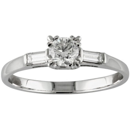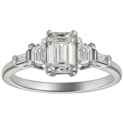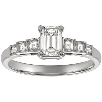 In the 1920s and 1930s, emerald-cut solitaire engagement rings in platinum became a popular Art Deco ring design. Emerald cut rings with baguettes featured the newly introduced rectangular baguette cut diamond, either in pairs next to the main stone or in a stepped configuration.