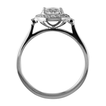 Discover our beautiful array of halo engagement rings, made in Hatton Garden, London. Some of our most-loved designs include diamond halo rings or coloured gemstones with a sapphire or emerald as the centre stone. Choose from a selection of round, oval, Asscher cut, cushion-cut and emerald cut halo engagement ring designs, with the option of a border of round or baguette diamonds. You can select from our ready-to-wear collection or customise your choice of gemstone to create a bespoke halo engagement ring.