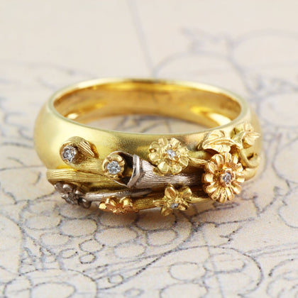 Designed by the London Victorian Ring Co, each floral ring carries a meaning of love and affection. Hand engraved and carved, these designs draw inspiration from Victorian era rings and are individually created and can be custom made as a personalised and unique floral message of your choice. These rings are worn as unique wedding rings or given as romantic rings for special occasions.