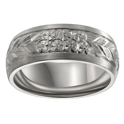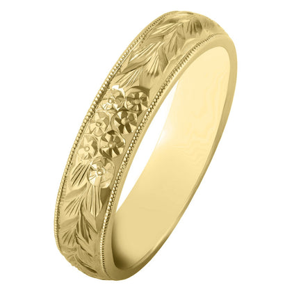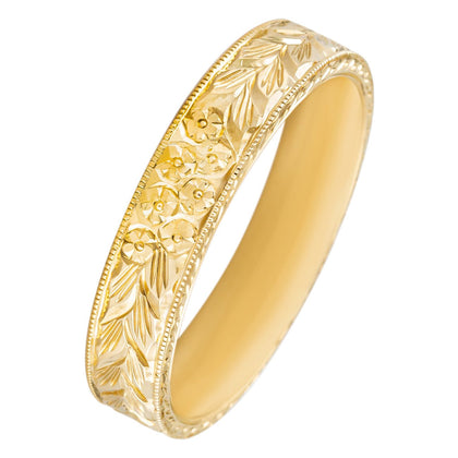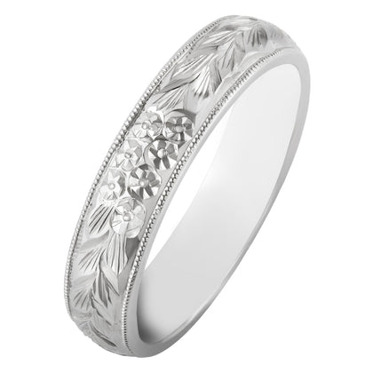 The Forget Me Not flower has always symbolised true love, and historically some vintage engagement rings have incorporated the floral design to represent the happy couple's eternal love. To honour this, our Forget Me Not rings and wedding bands feature floral engravings based on the beautiful Forget Me Not flower, bringing the vintage style into a new era. You will find Forget Me Not jewellery designs throughout our selection of wedding rings, all exclusively made with care in the UK.