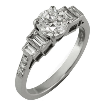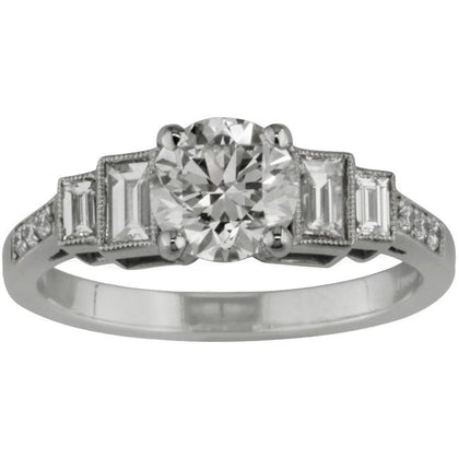 If you are looking for a distinctive ring with a unique vintage style, our collection of Art Deco engagement rings offers a stunning selection with a nod to the past. Utilising angular lines and the sharp geometry of baguette-cut diamond accents or stepped diamond shoulders, our Art Deco style diamond rings echo the streamlined beauty of this iconic era.