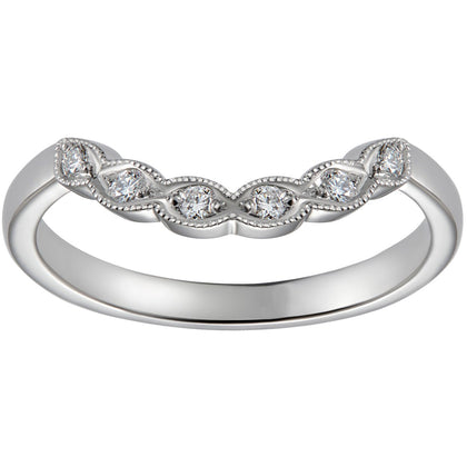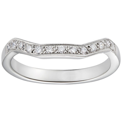 This shaped diamond wedding ring in 18ct white gold makes an ideal bridal set with a low-sitting halo engagement ring. This expertly designed 2.2mm wide ring curves around the cluster. The 11 round diamonds are grain set and edged with vintage style millegrain (milgrain).