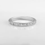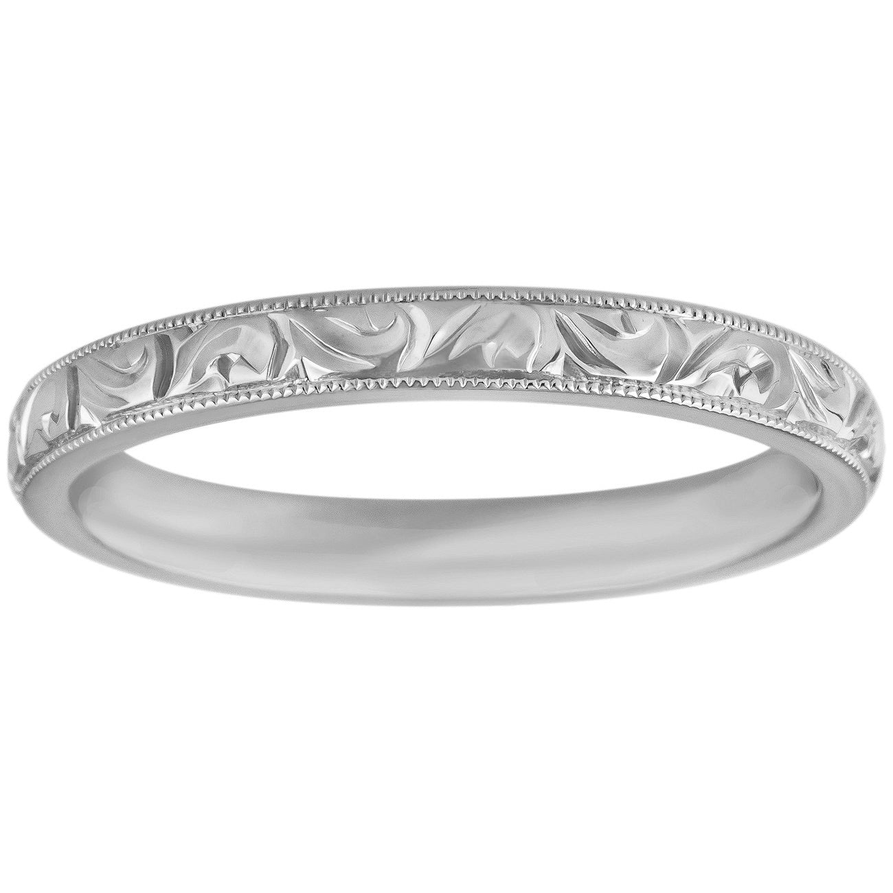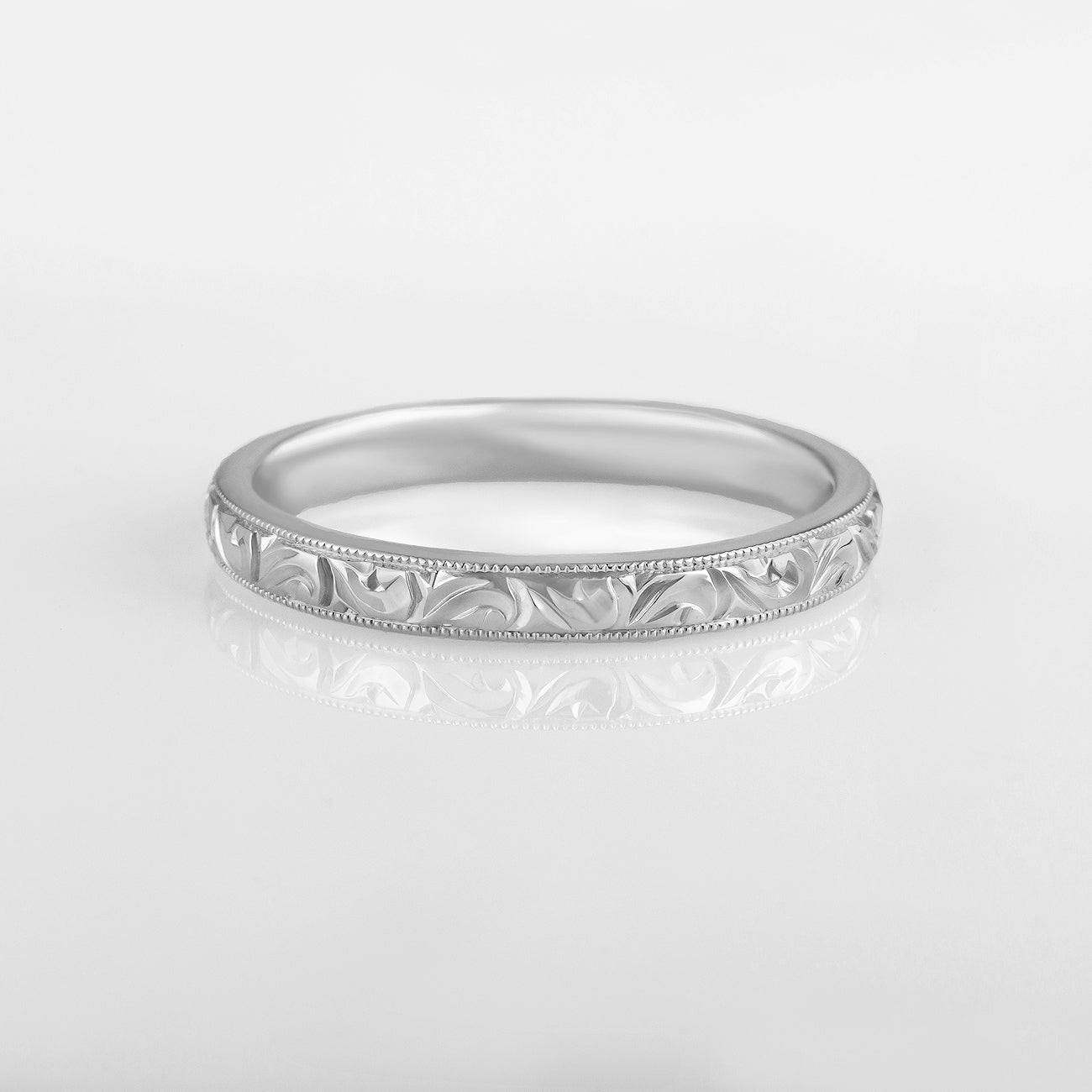 This hand-engraved wedding ring for women is made in platinum 950. The delicate vintage style scroll pattern is finished with millegrain (milgrain) beading around the edges of the 3mm band.