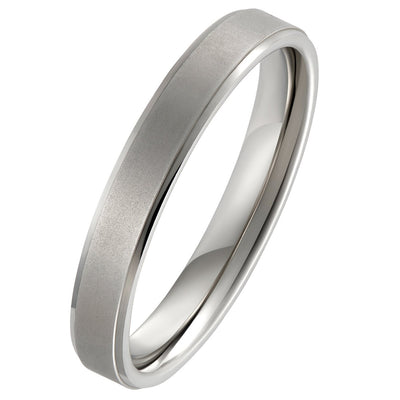 This brushed men's wedding ring is completed with lightly bevelled edges. The 3mm band is made in platinum 950. The raised centre is brushed and the bevelled edges have a polished finish.