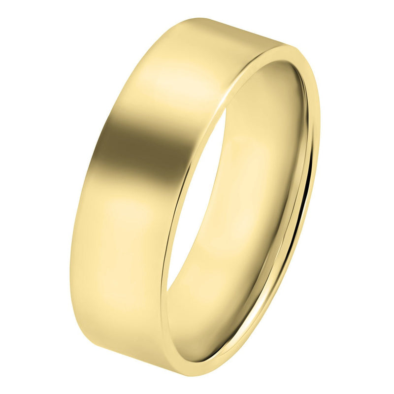 This 18ct yellow gold 7mm wedding ring features a modern flat court profile with a brushed finish. The inside is rounded for a comfortable fit.