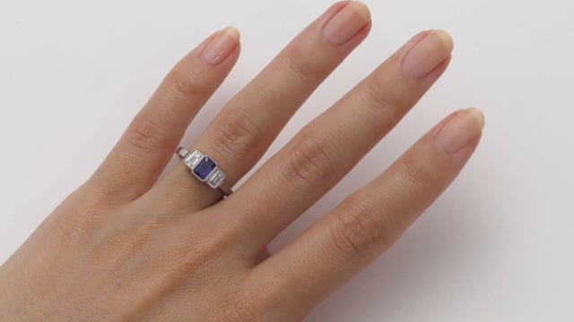 This sapphire and diamond engagement ring in platinum features an emerald-cut sapphire with two emerald-cut diamond side stones.
