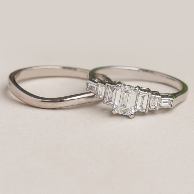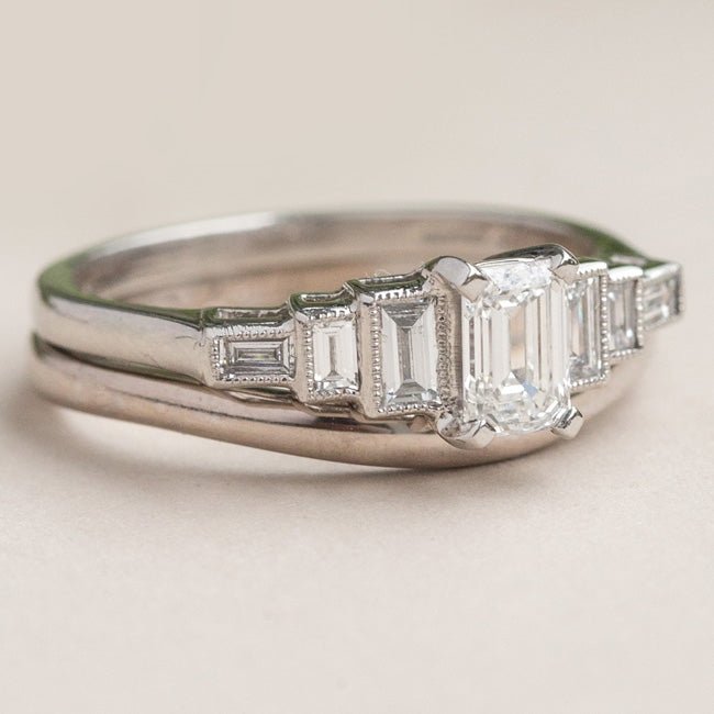 Choose either a baguette diamond wedding ring or traditional wedding band to create a vintage bridal set.