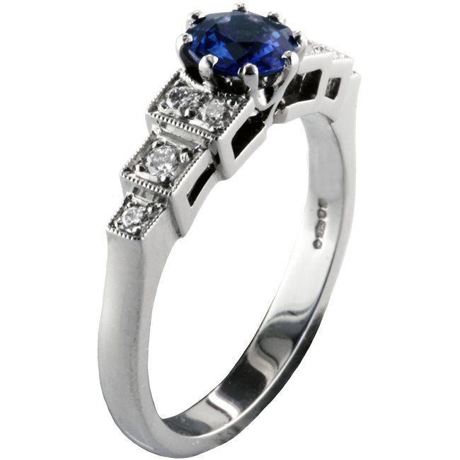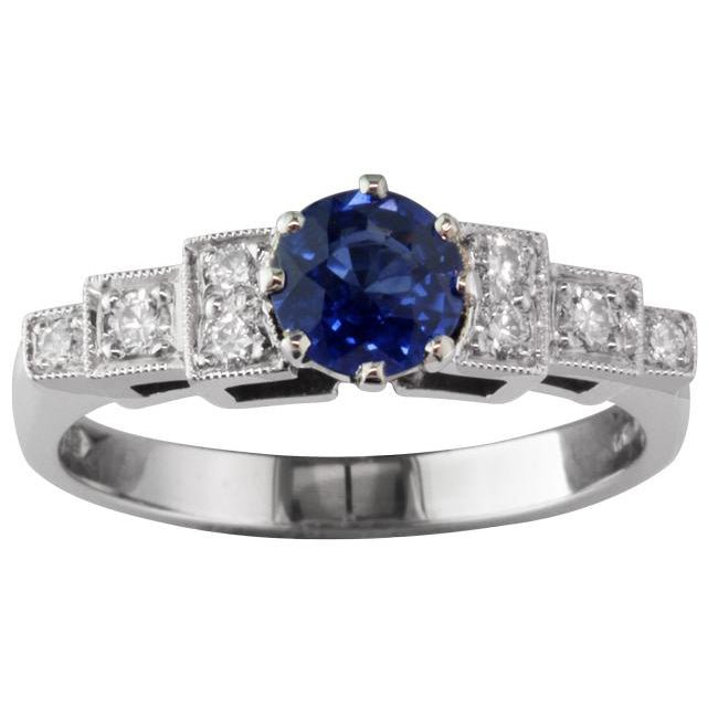 This unusual sapphire and diamond ring in platinum features tiered diamond-set shoulders that were characteristic of the Art Deco age in the early 20th century. This ring is made today in the same vintage style for the couple who are looking for something different. The bright blue sapphire is held by eight claws in a round setting. This leads to an impressive band with four diamonds on each side. The diamonds weighing 0.11 carat in total are grain set in boxes and the boxes are then millegrain edged with tiny beads of platinum.
