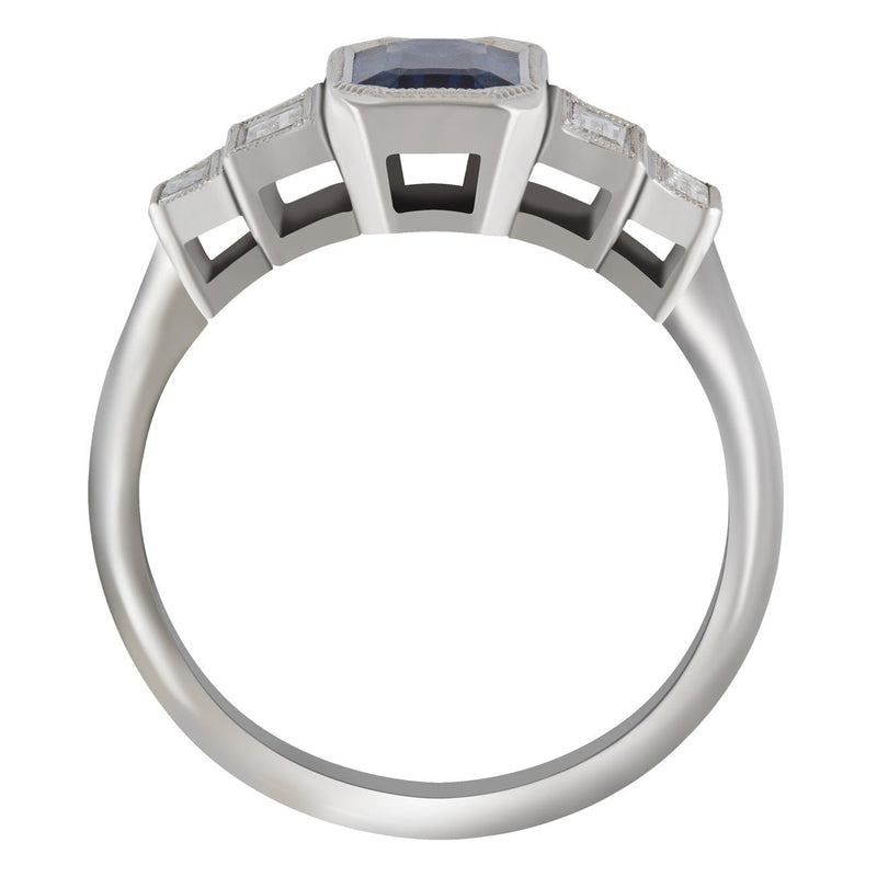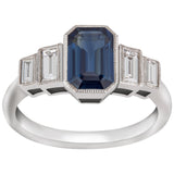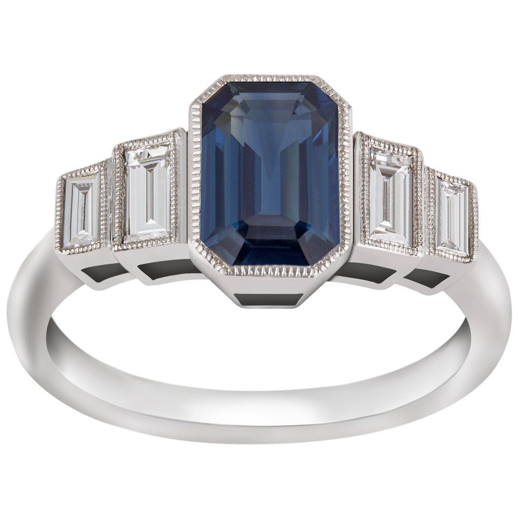 This exquisite Art Deco-inspired ring features a 1 carat emerald-cut sapphire surrounded by four F/G colour VS clarity baguette-cut diamonds weighing 0.33 carat. The five gemstones are edged with hand-applied millegrain (milgrain) for a vintage look and set on a comfortable D-shape platinum band. Shop this exclusive engagement ring securely online or make an appointment to visit us in Hatton Garden, London.