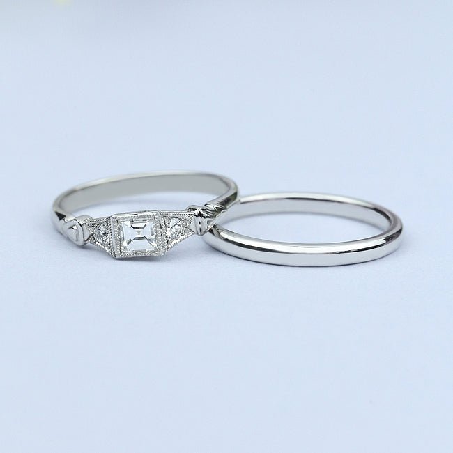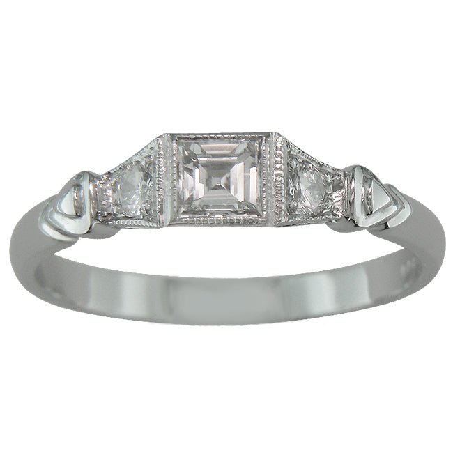 The unusual square step-cut diamond is set in a decorative box. The diamond is secured by a rubover setting in which the upper edge of the box holds the diamond around all four sides. To complete the setting, a millegrain finish consisting of small beads which have been applied around the edges.