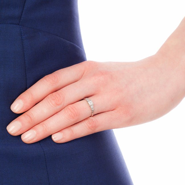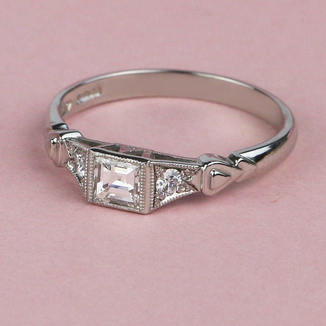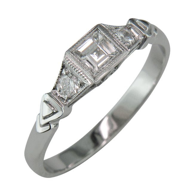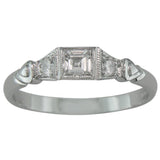 A round brilliant cut diamond and Art Deco design triangular motifs feature on either side of the central diamond. The diamonds are grain-set and edged with millegrain.