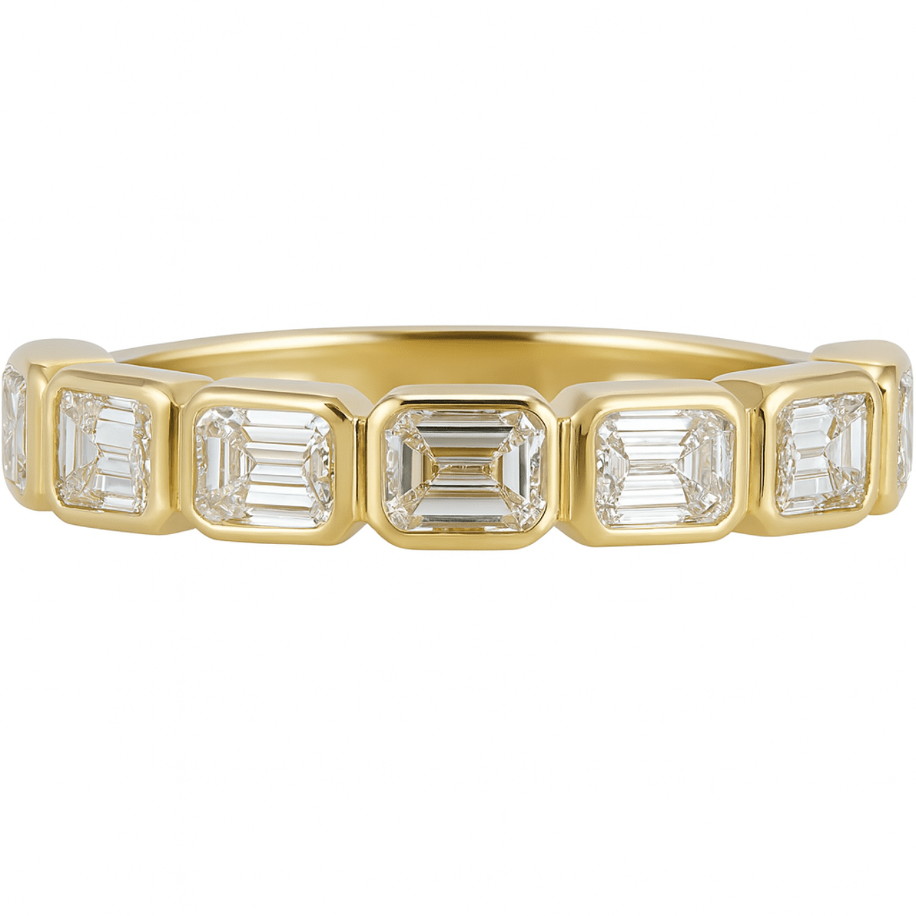 This bespoke wedding ring is crafted in 18 carat yellow gold featuring five baguette cut natural diamonds set neatly along the band.