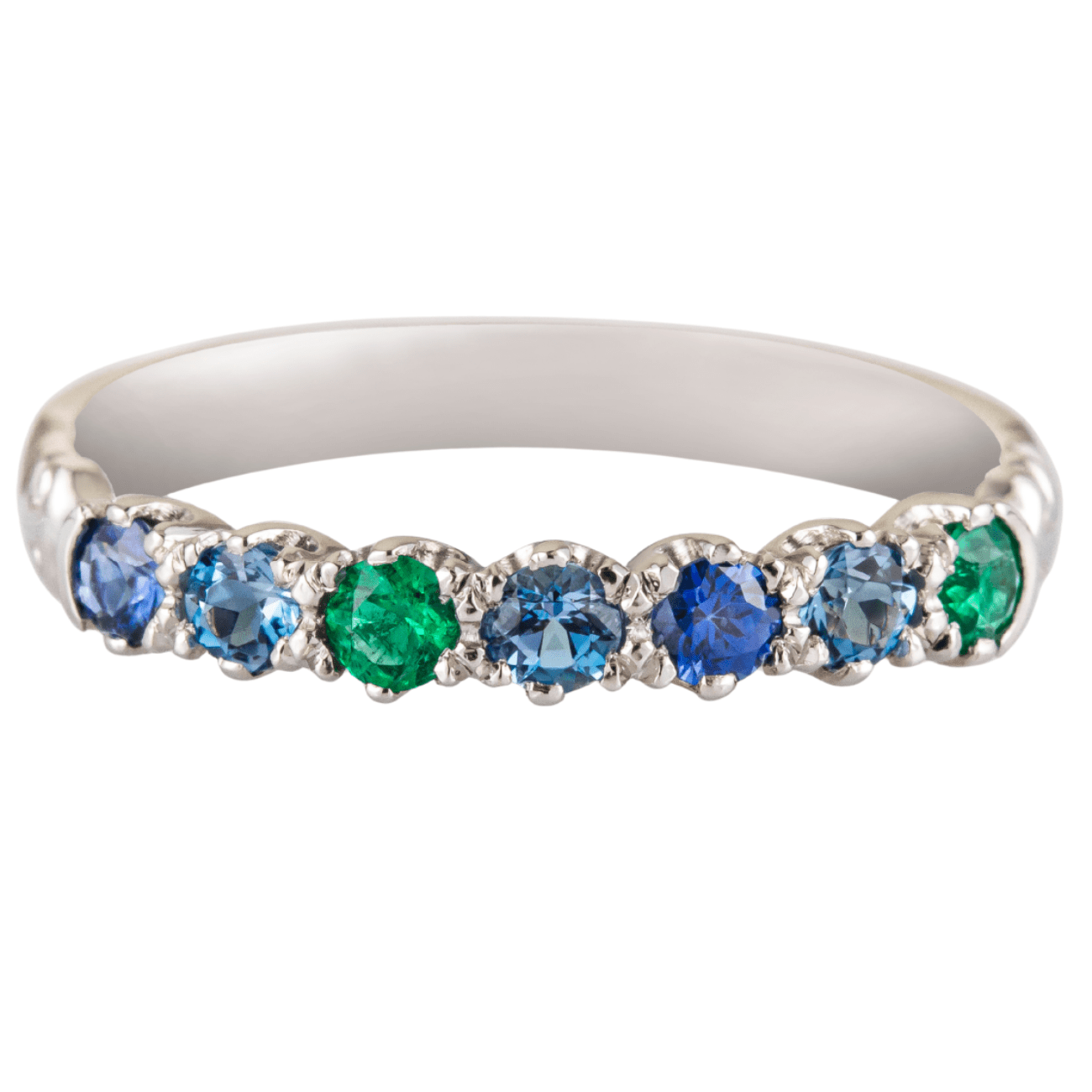This is a bespoke Victorian style romantic or love ring, set with a beautiful combination of Aquamarines, Emeralds, and Sapphires. The delicate arrangement of gemstones creates a captivating display of soft blue and vivid green hues, symbolising calm, balance, and everlasting affection.