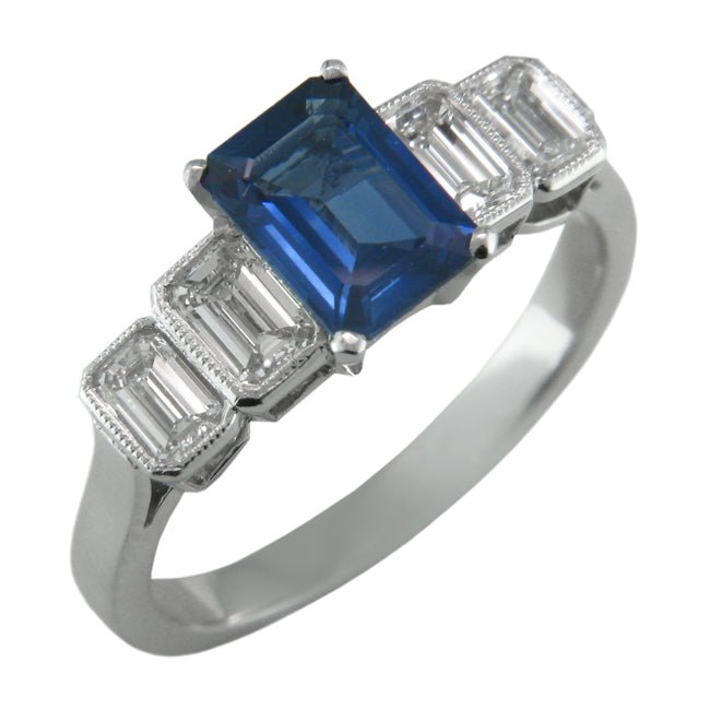This emerald-cut sapphire and diamond ring can be set with a central diamond, ruby or another suitable gemstone of your choice. Please contact us to begin designing your ring.