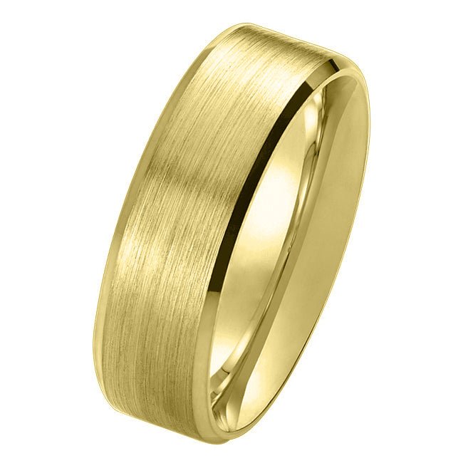 This 6mm 18 carat yellow gold wedding ring has a flat court shape with a brushed matt finish. The central finish contrasts with the mirror polish bevelled edges.