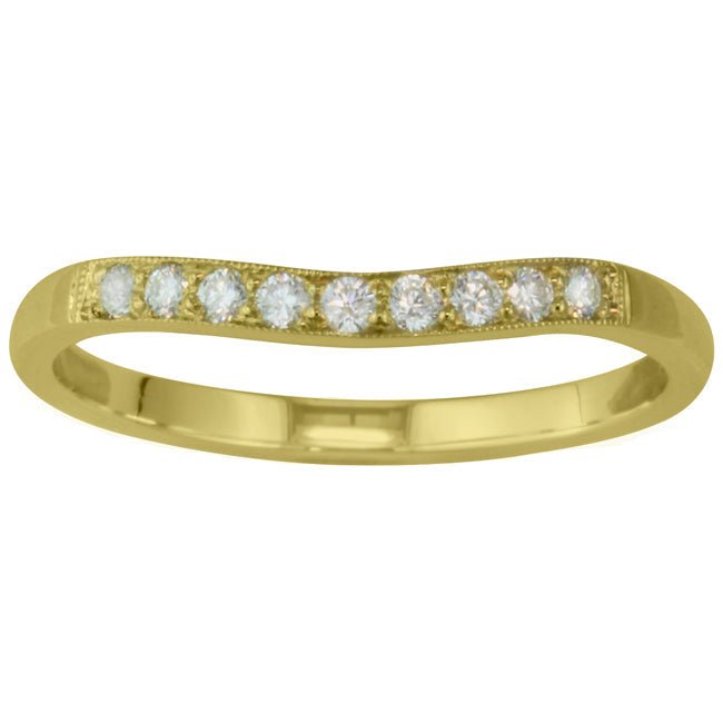 This diamond and yellow gold ring is designed to gently curve around the central gemstone of your engagement ring. The finely shaped ring can be worn as a wedding or eternity ring.