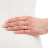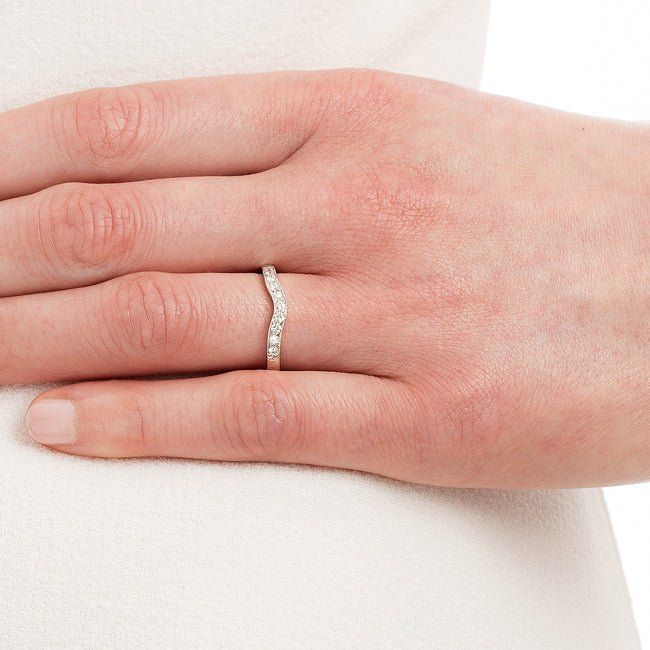 A 2.5mm curved diamond wedding band in a classic style, perfect for engagement rings with low-set diamonds. This shaped wedding ring with pave set diamonds is suitable for many of our Art Deco and Edwardian style engagement rings.