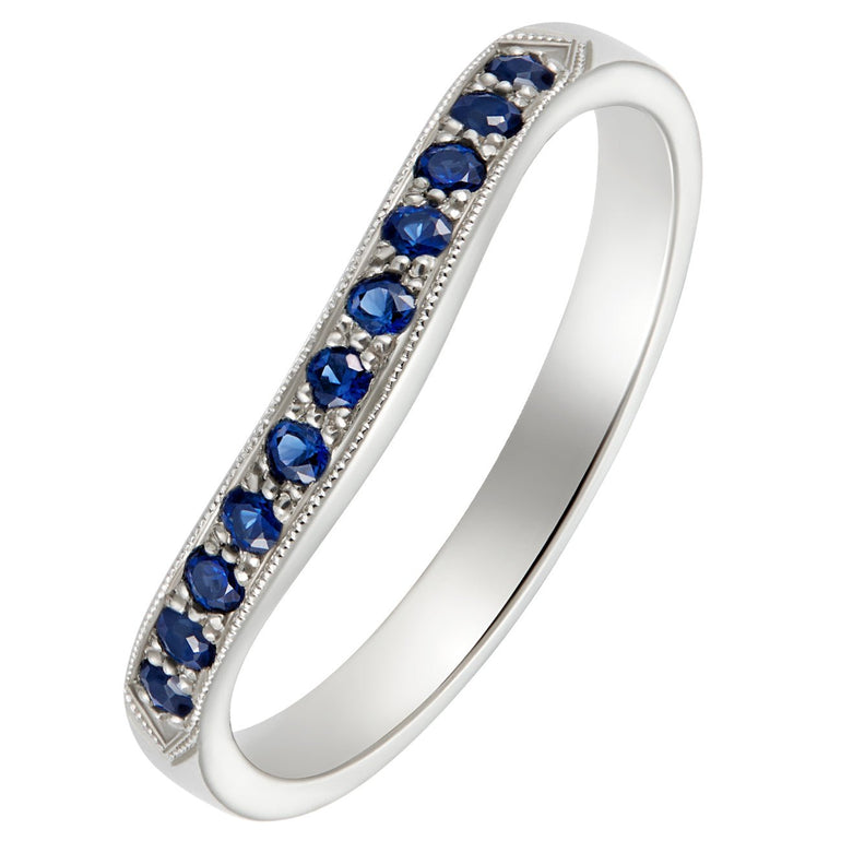 This curved sapphire eternity ring or wedding ring in platinum features 11 round sapphires. This beautiful blue gemstone provides a sparkling alternative to a diamond ring. The sapphires are cut with precision and accent the curved design, creating a unique piece of jewellery. Hand-applied platinum millegrain (milgrain) beading surrounds the sapphires, giving the ring an elegant vintage style.
