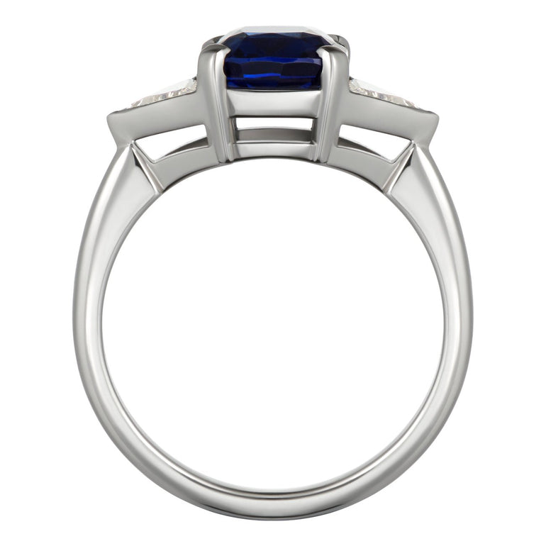 Cushion Cut Blue Sapphire Three Stone Ring with Triangle Diamonds