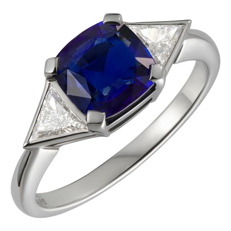This captivating one-of-a-kind three-stone sapphire and diamond ring features a 2.04 carat cushion cut blue sapphire set between two triangle diamonds weighing 0.32 carat in total.