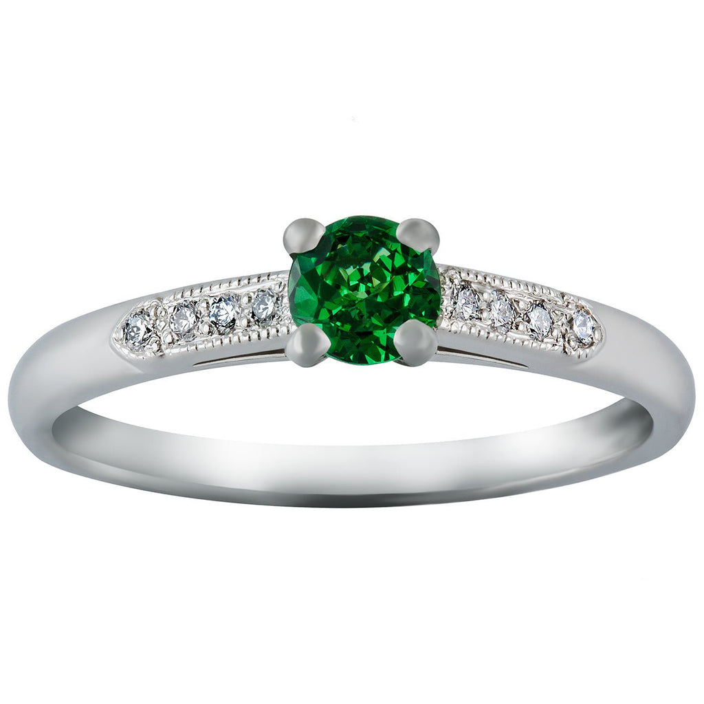 This unique engagement ring contains a round tsavorite in the centre, held securely with four claws. Three diamonds on each shoulder lead to another diamond, in a heart motif. The diamonds are set in the platinum band with a delicate millegrain beading, creating an elegant Edwardian-inspired look.