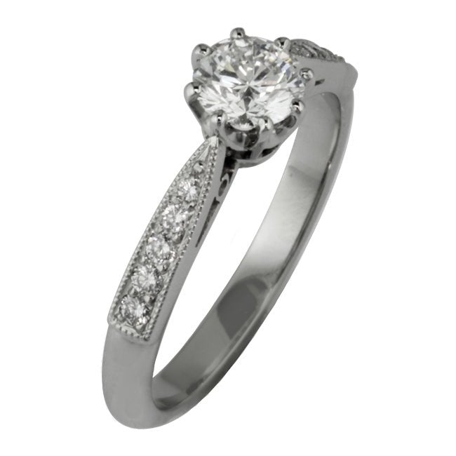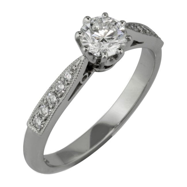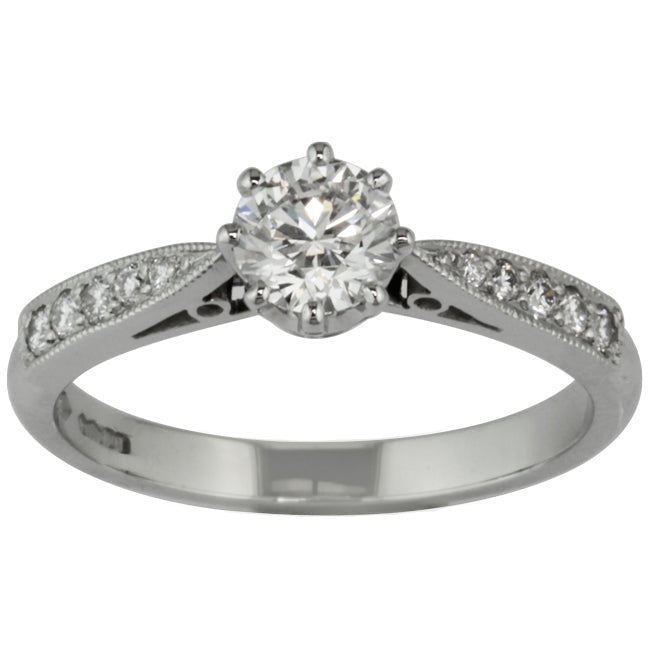An eight-claw setting holds the centre round brilliant cut diamond.