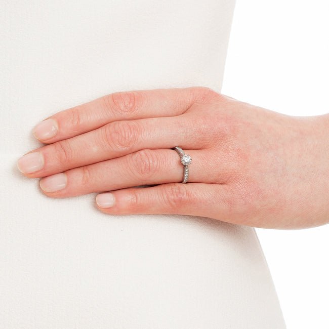 This elegant platinum engagement ring features a GIA graded central diamond highlighted by five sparkling diamonds on each side of the band.