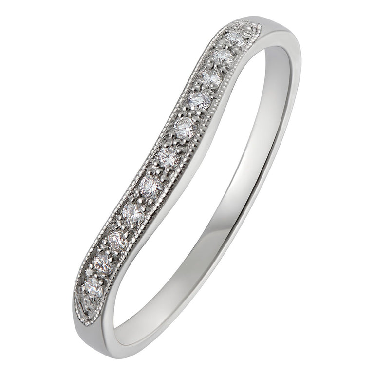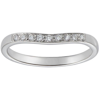 This 2.2mm curved diamond wedding ring has eleven round diamonds set in 18ct white gold. The gently shaped band is suitable for many vintage and modern low set engagement rings.
