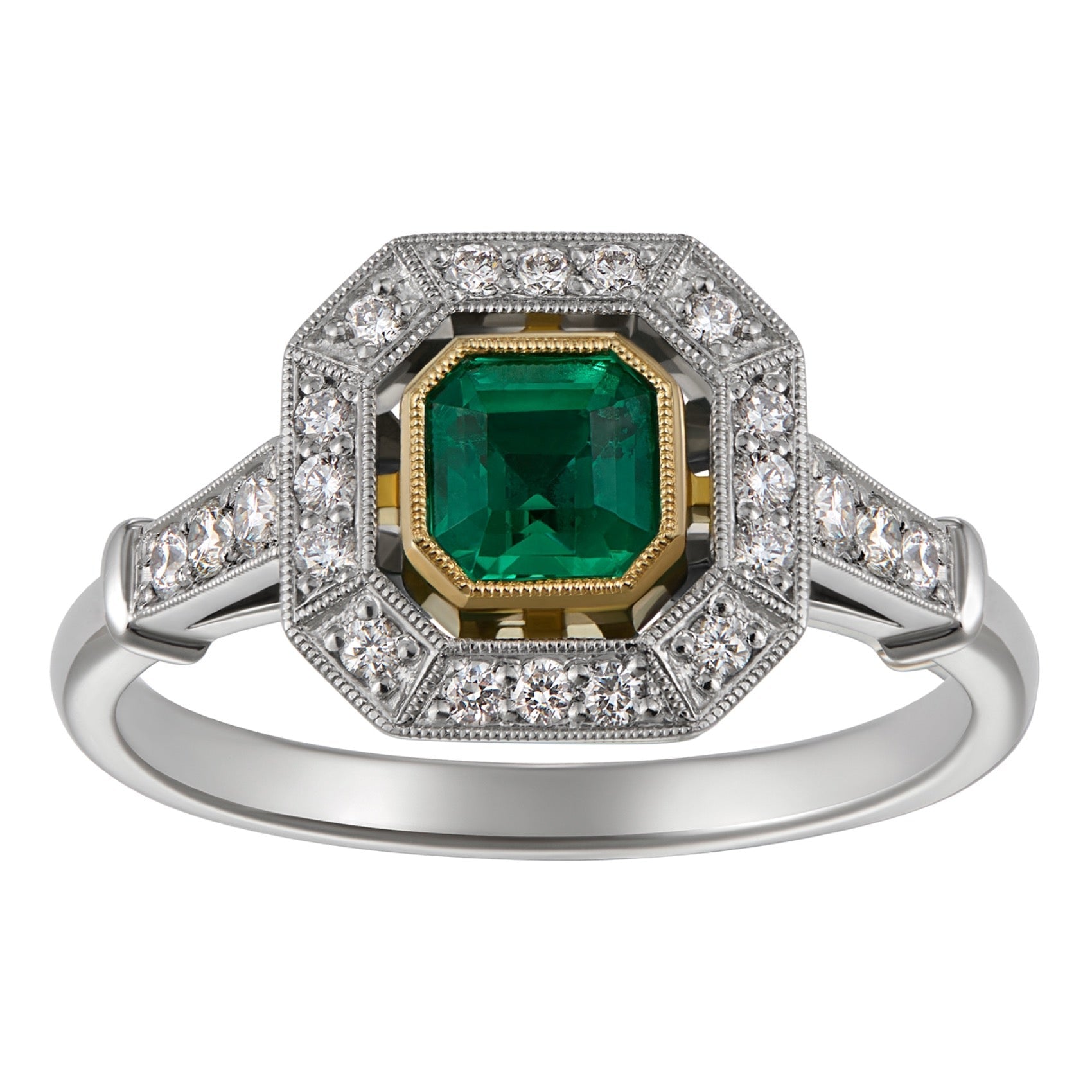 This emerald and diamond cluster ring is made in the Art Deco style and features a beautiful 0.51 carat emerald surrounded by 22 bright and lively round diamonds.