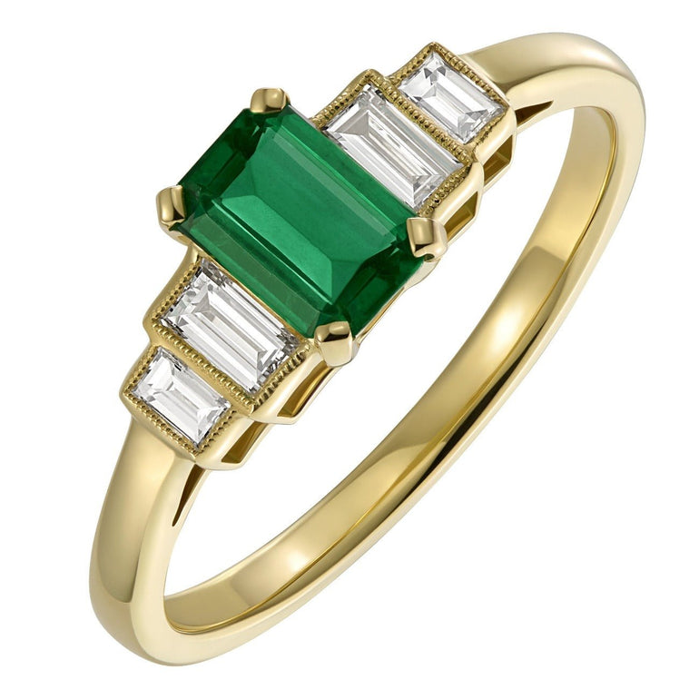 This five-stone ring features a central emerald with baguette diamonds set in an 18 carat yellow gold band. Inspired by the Art Deco era, this emerald ring has a fine millegrain beading in keeping with the vintage style.