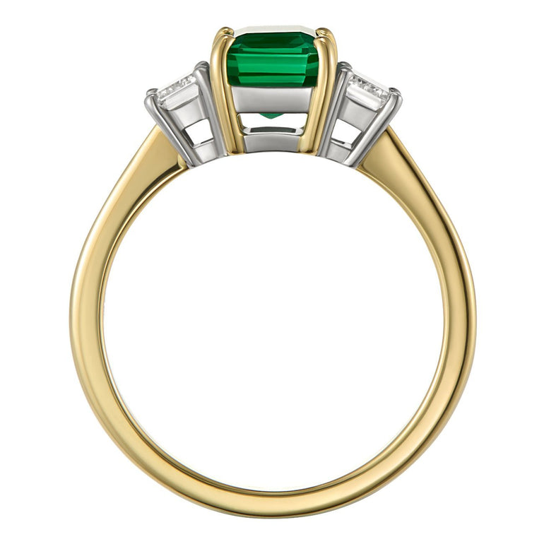 This elegant Art Deco style three stone ring features an outstanding quality emerald flanked by emerald-cut diamonds. The two diamonds are set in platinum to emphasise the white of the gemstones, while 18ct yellow gold was chosen to hold the emerald and create the band.