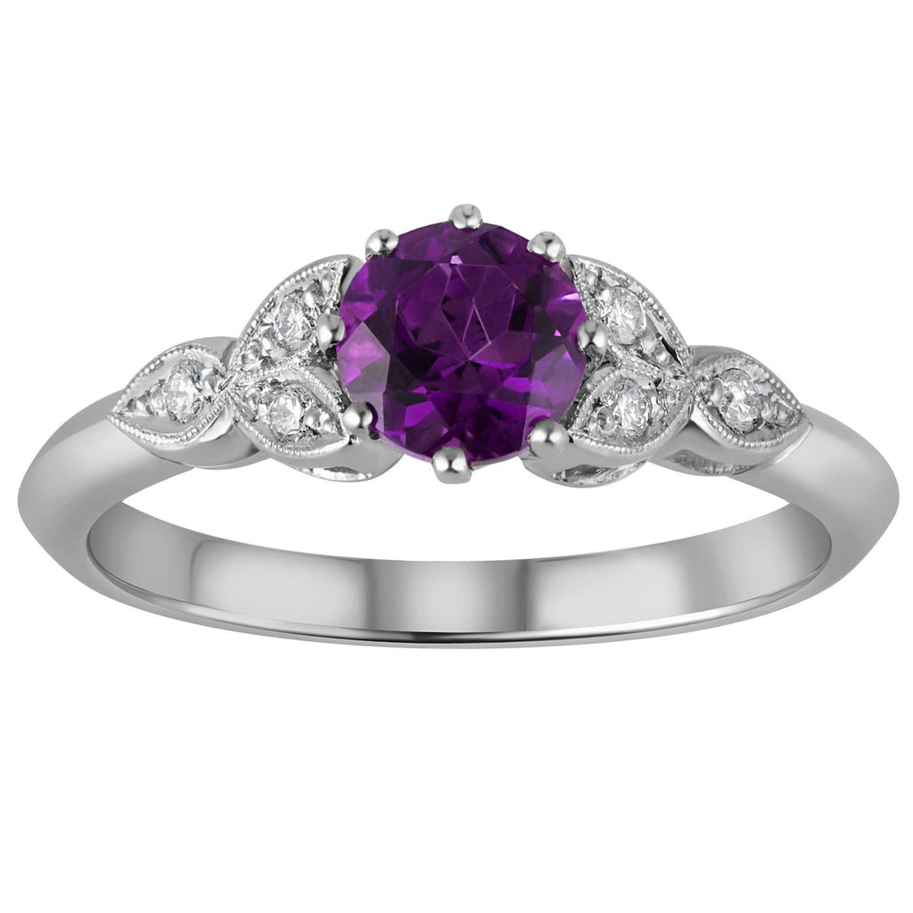 Our floral amethyst and diamond ring is made with a vintage mould from the Edwardian era and features a vibrant round brilliant-cut amethyst at its centre. The royal hue of the purple gemstone is beautifully complemented by diamond-set shoulders, intricately designed in a delicate trio of leaves. Each diamond is accented by fine milgrain edges.