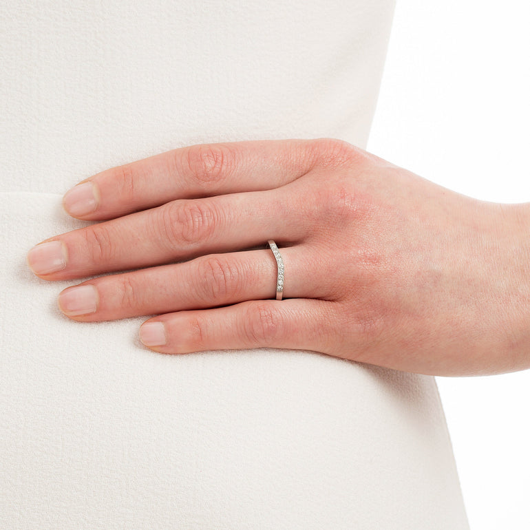 Curved diamond wedding ring with diamonds set in white gold band on hand