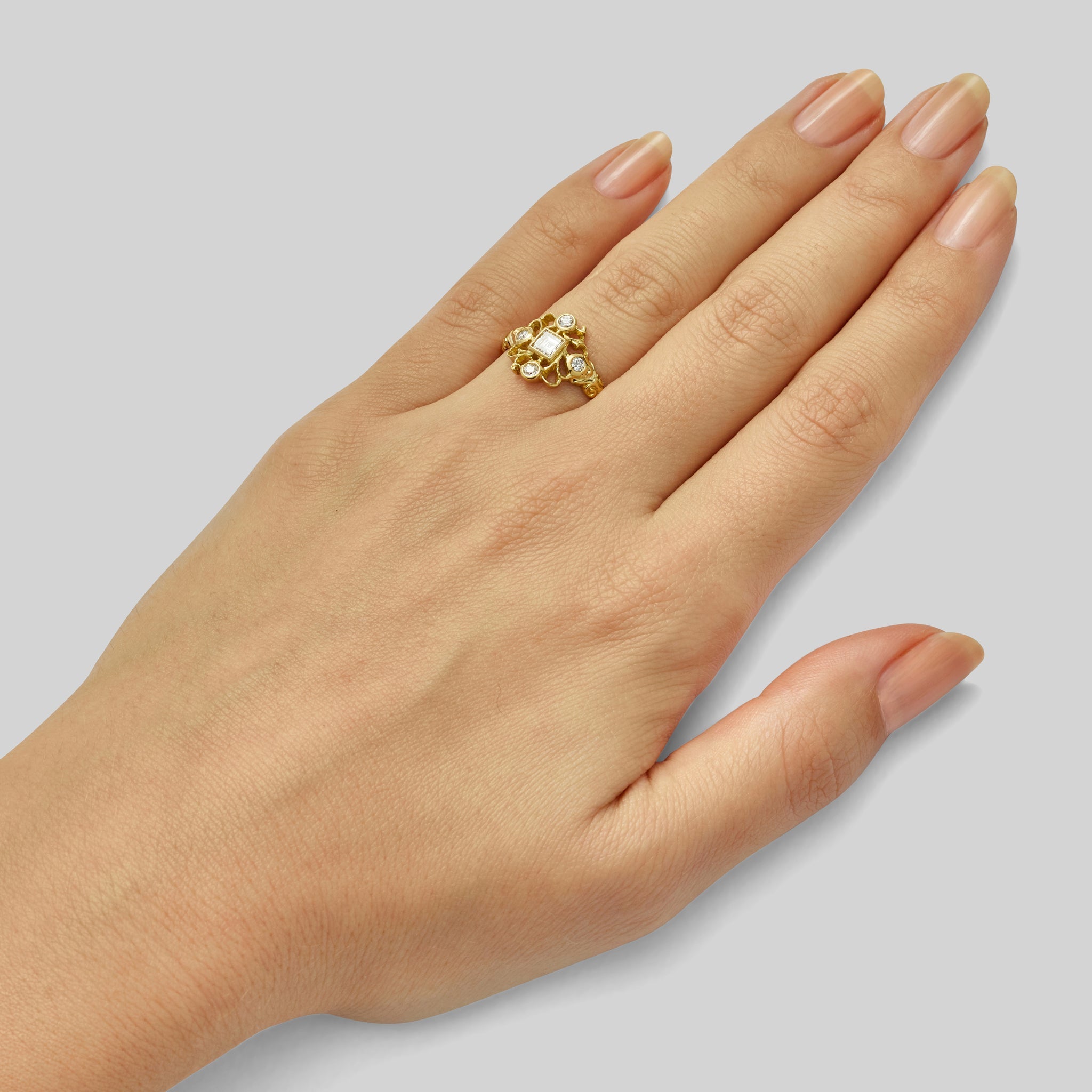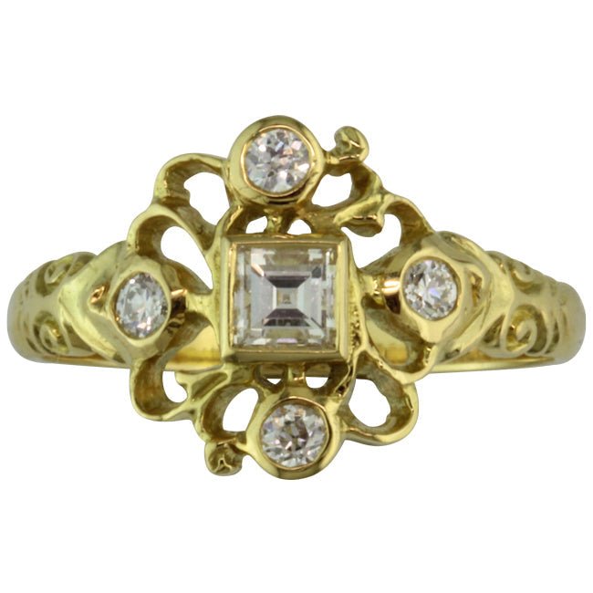 This antique style diamond ring has been created from an original ring from the early 1800s. The central square step cut diamond is surrounded by four round old cut diamonds