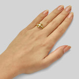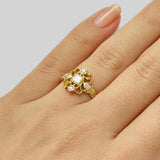 This ring shows the pierced scroll work popular during this time. Decorative carved shoulders complete the design in this 18ct yellow gold ring.